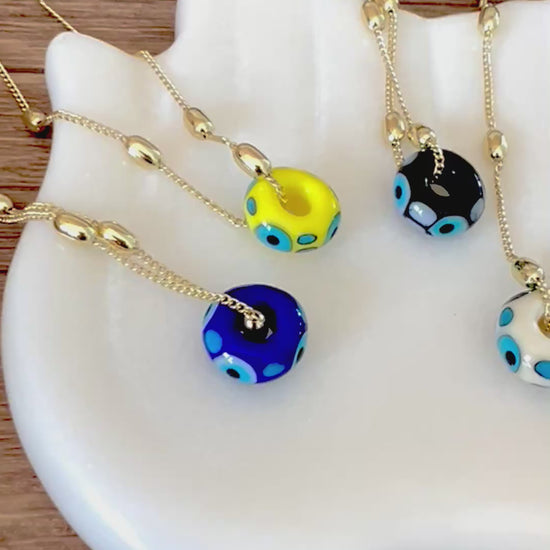 Colorful, playful, and powerful. The Ojo Donita necklace features a handcrafted glass evil eye bead in a unique donut shape, paired with a high-quality gold-plated (over brass) chain for a rich, lasting shine.
